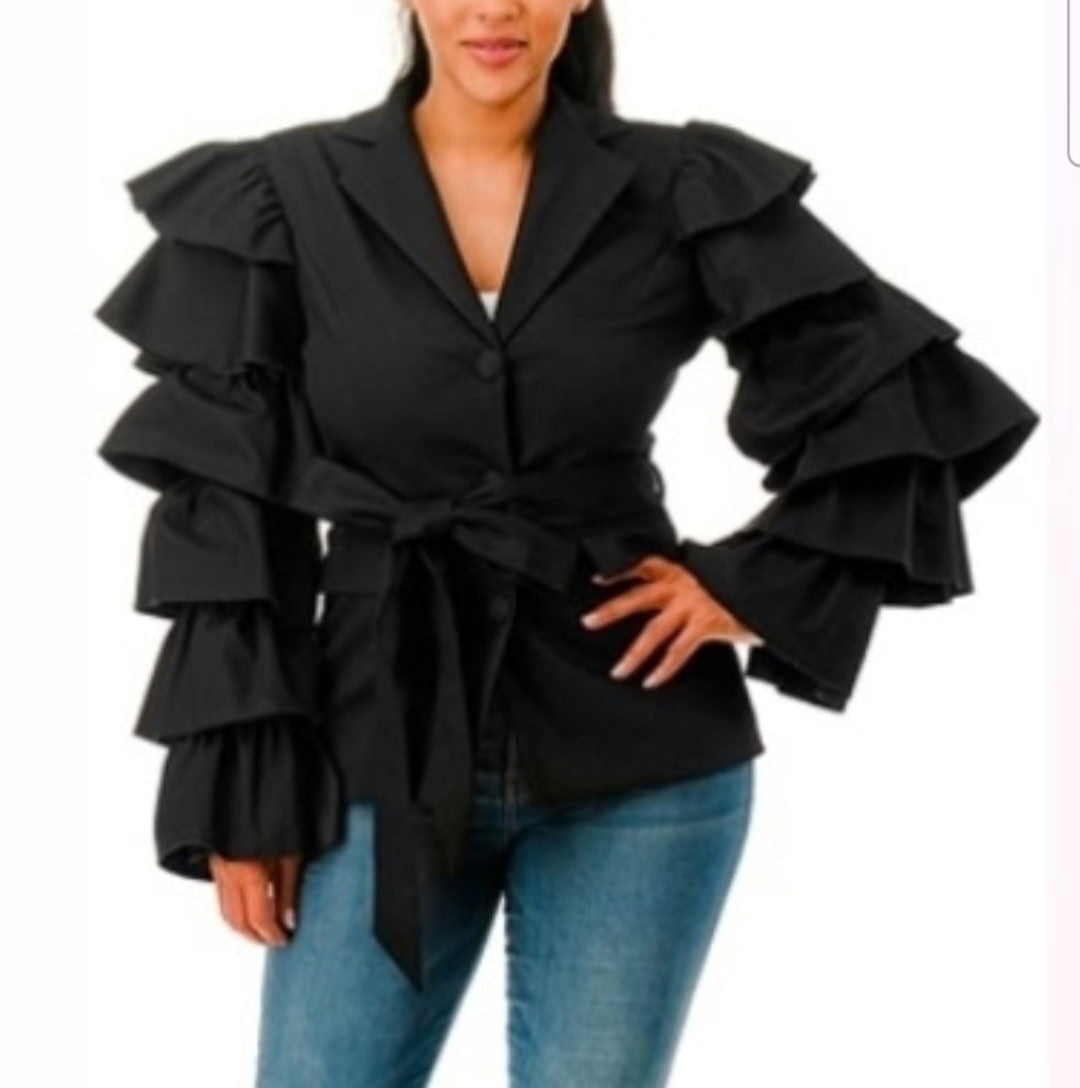 Introducing ELEVATE, the ultimate must-have blazer for the modern woman. With its tie waist and alluring ruffled sleeves, this blazer effortlessly combines sophistication and sexiness. Whether you're conquering the boardroom, hitting the club, or attending church, this unique and klassy blazer is sure to turn heads. Elevate your style game now.